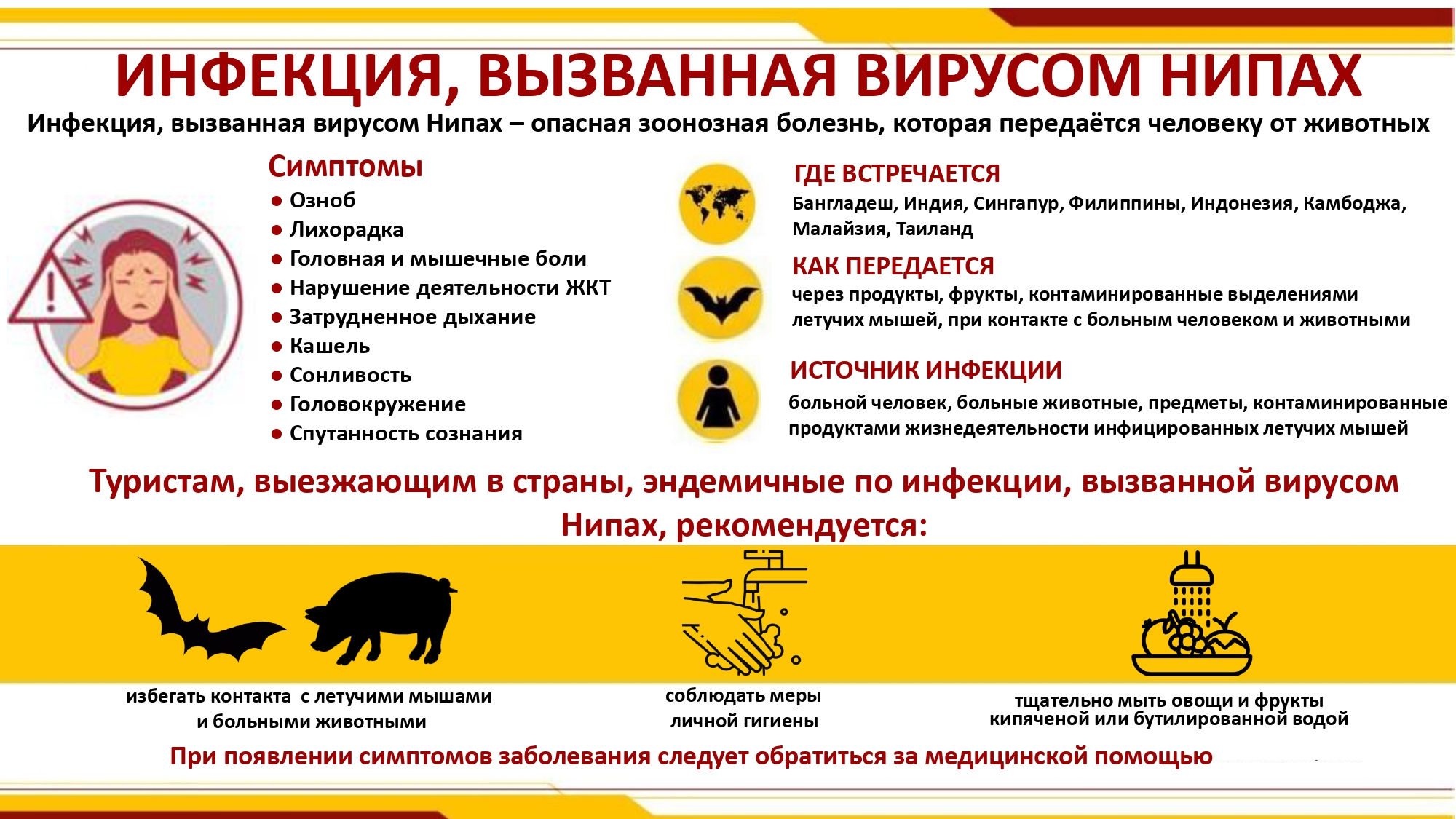 ВОЗ оценивает риск широкого распространения и пандемии БВВН как низкий. Основной путь передачи инфекции – контакт с инфицированными 2 летучими мышами, крыланами (Pteropus), не обитающими на территории Российской Федерации, а также употребление пищи, загрязненной отходами их жизнедеятельности. Передача от человека к человеку возможна лишь при тесном контакте, поэтому изоляция заболевших является высокоэффективной мерой профилактики.